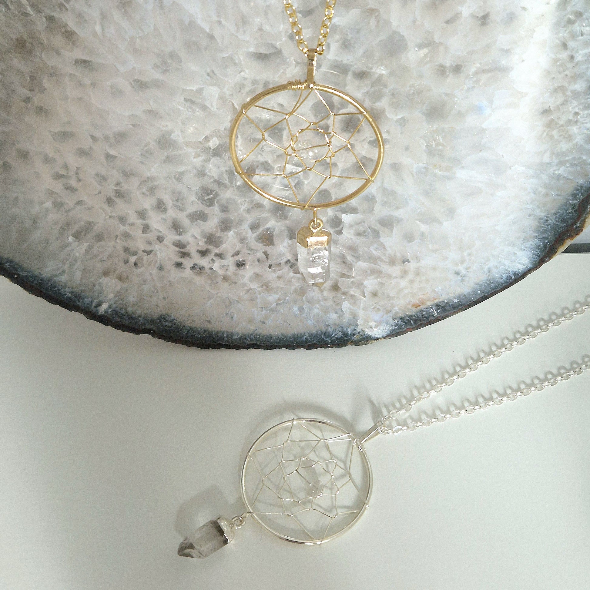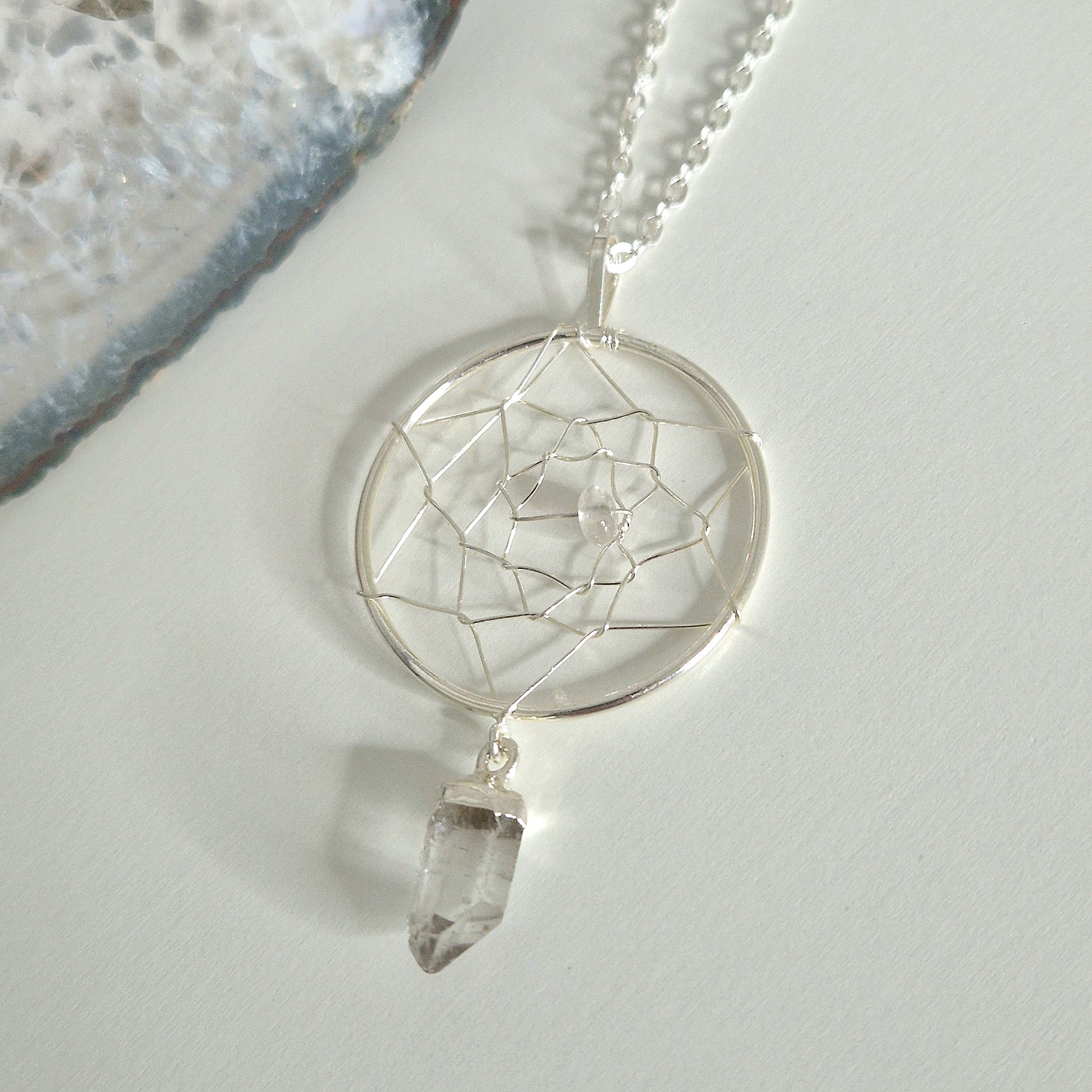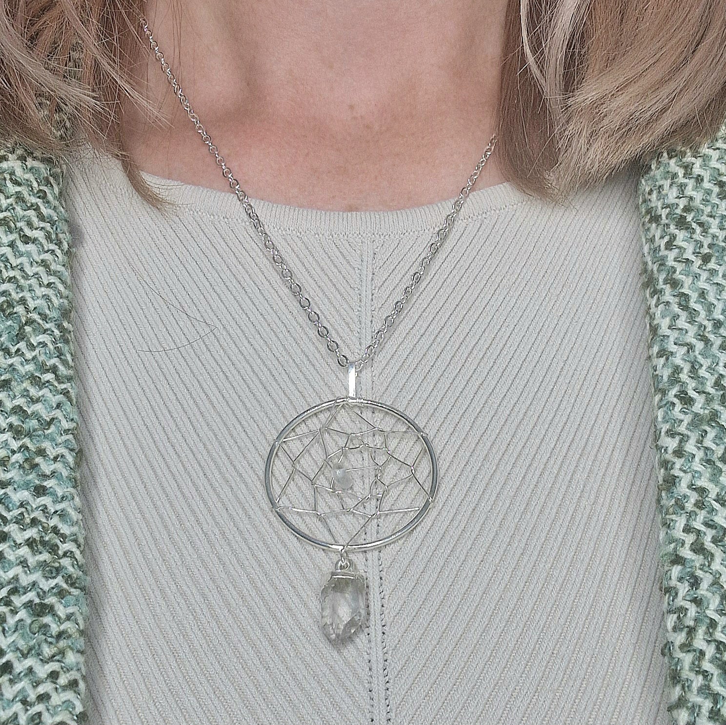 Lassen Sie sich von der Traumfänger-Kette mit Bergkristall als kraftvollem Symbol für Schutz, Klarheit und positive Energie leiten – ein bedeutungsvolles Schmuckstück, das Sie nah am Herzen tragen können.